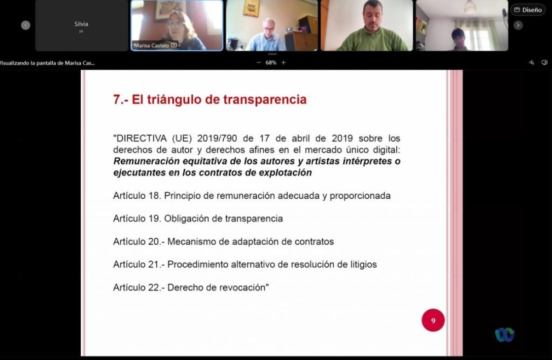De forma particularizada, Marisa Castelo abordó la remuneración equitativa de los autores y artistas intérpretes o ejecutantes en los contratos de explotación, en relación con los art.18 a 22 de la Directiva 2019/790. En particular, el art.21 aboga por la aplicación de procedimientos alternativos para la resolución de litigios.